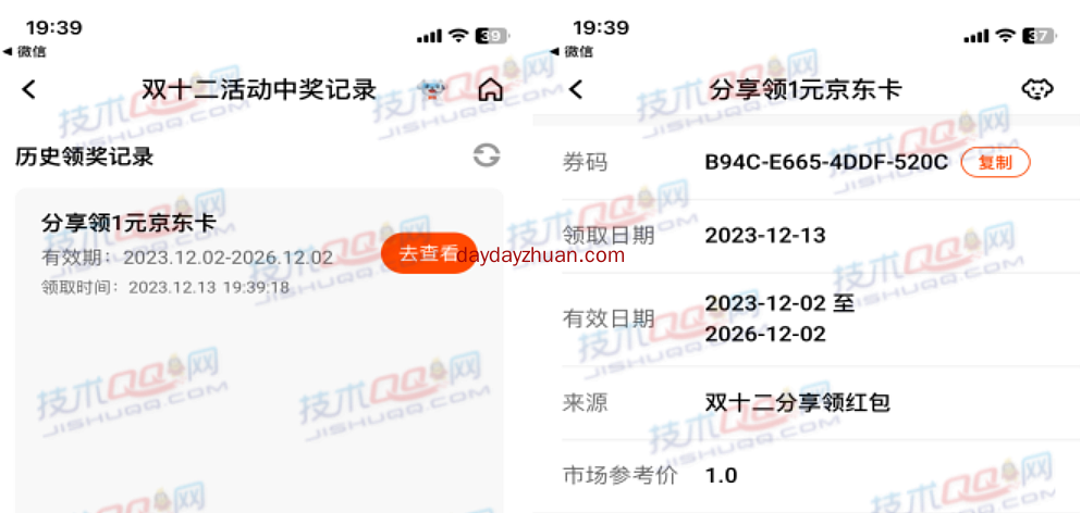 2、完成分享后返回活动首页右上角【我的奖品】里面可以查看京东E卡卡密