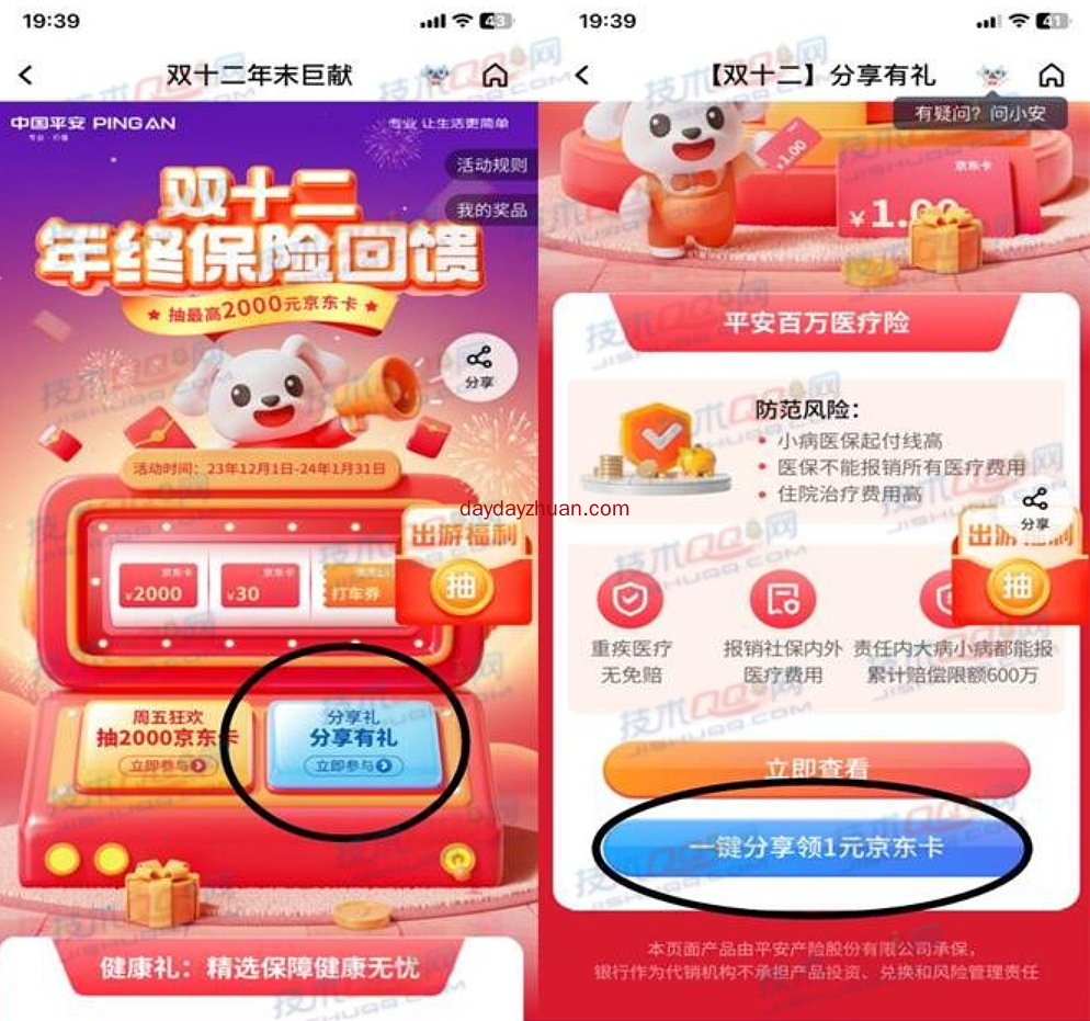 1、打开平安口袋银行APP扫码或者搜索【双十二】进入【保险双十二】点击【分享有礼】下拉【一键分享领1元京东卡】